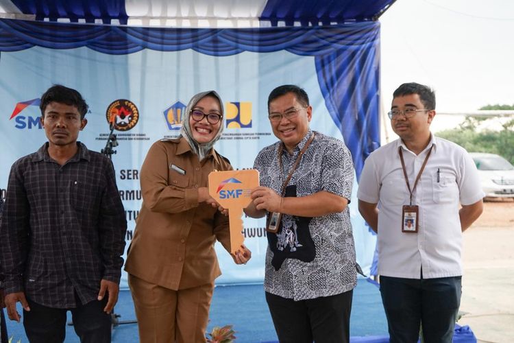 Penyerahan 27 Rumah Layak Huni secara simbolis, oleh Wakil Wali Kota Cirebon Eti Herawati, Direktur Utama SMF Ananta Wiyogo, dan Kepala Seksi Pelaksana II BPPW Jawa Barat, Bapak Ardian Daniswara, dan penerima manfaat Rohadi, Senin (20/3/2023).