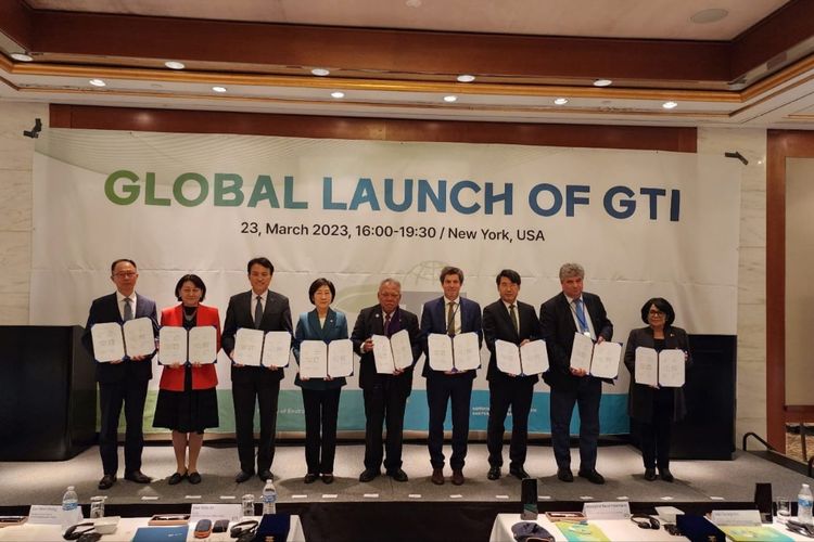 Menteri PUPR Basuki Hadimuljono bersama Menteri Lingkungan Hidup Korea Han Wha-jin, serta perwakilan negara dan institusi global dalam UN 2023 Water Conference (Konferensi Air PBB 2023) meluncurkan Platform Green Transition Initiative (GTI), di New York, Kamis (23/3/2023).(Kementerian PUPR)
