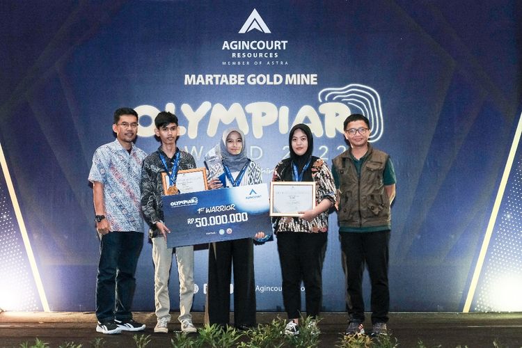 im Magsite dari Universitas Diponegoro meraih Juara I dalam Olimpiade Agincourt Resources (OlympiAR) 2022 yang pertama kalinya diadakan PT Agincourt Resources. Tim Magsite (tengah) berfoto bersama Wakil Presiden Direktur PT Agincourt Resources Ruli Tanio (kanan) dan Ketua MGEI, STJ Budi Santoso (kiri)(PTAR)