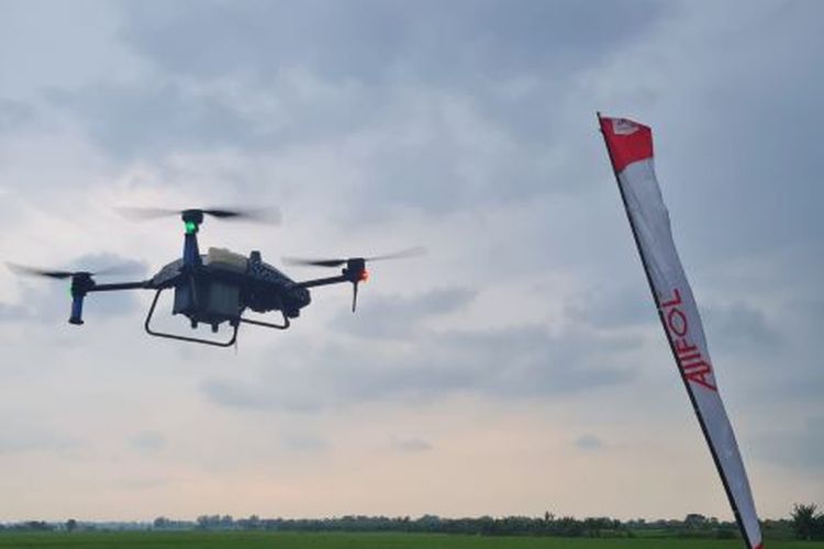 Foto ilustrasi demonstrasi penyebaran pupuk Ajivol menggunakan drone ke sawah di Desa Gayam, Kabupaten Mojokerto, Jawa Timur, bertepatan dengan peringatan Hari Pers Nasional, 9 Februari 2023.