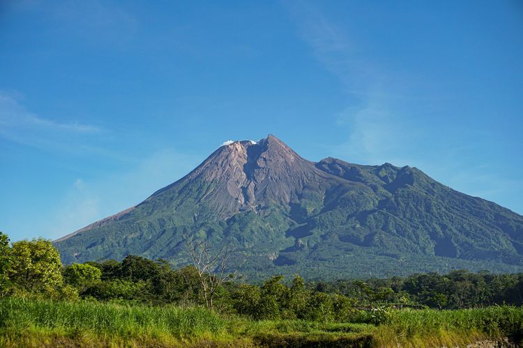 Gunung Merapi dilihat dari Bendungan Kendalsari atau Karangkendal, Kemalang, Klaten, Jawa Tengah. Gunung Merapi diketahui memiliki dua kubah lava setelah ditemukan kemunculan kubah lava baru pada 2021.