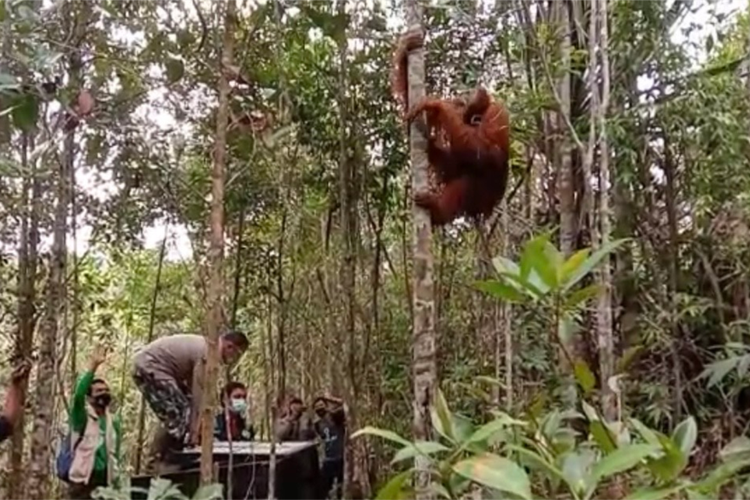 Orangutan Tapanuli saat dilepasliarkan di Cagar Alam Dolok Sipirok, Tapanuli Selatan, Sumut. Senin 23 November 2020.