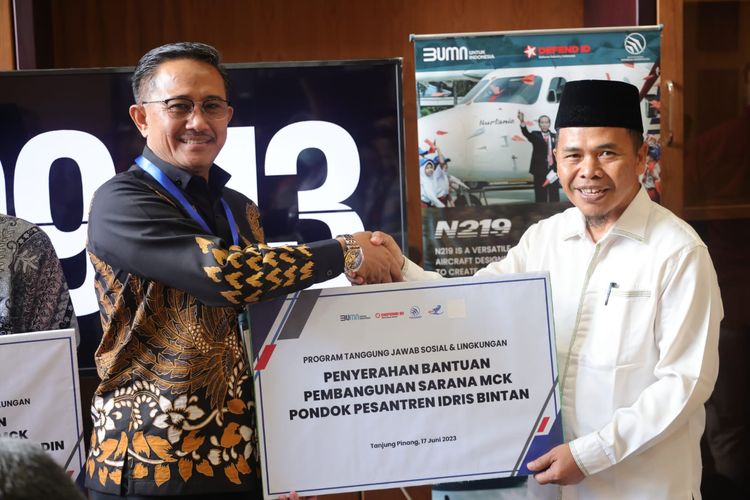 Direktur Niaga, Teknologi & Pengembangan PTDI, Moh Arif Faisal kepada Pimpinan Pondok Pesantren Syaikh Zainuddin Nahdlatul Wathan Bintan, Saepuddin dan Ketua Pembina Yayasan Pondok Pesantren Idris Bintan, Muqtafin Trenggono di Bandara Internasional Raja Haji Fisabilillah, Tanjungpinang, Kepri. (PTDI)