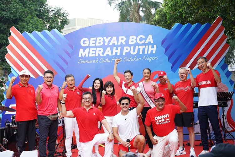 Jajaran Komisaris dan Direksi BCA berfoto bersama dengan bintang tamu kegiatan Gebyar BCA Merah Putih di CFD Jakarta (28/8/2023).