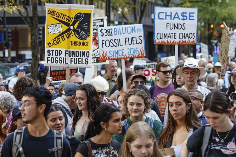 Sejumlah aktivis iklim melakukan pawai dalam Global Climate Strike 2023 di pusat kota Chicago, Illinois, pada Jumat (15/9/2023). Berbagai kelompok di AS menyerukan diakhirinya era bahan bakar fosil dalam Global Climate Strike 2023.(AFP/KAMIL KRZACZYNSKI)