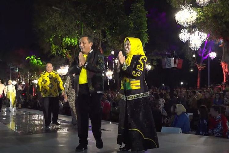Gubernur Kepri Ansar bersama Ketua TP PKK Kepri Dewi turut ikut memeriahkan dan menampilkan peragaan batik di atas Catwalk istana Berbatik yang langsung disaksikan Presiden Jokowi beserta ibu negara Iriyana Jokowi dan para tamu undangan lainnya, Jakarta, Minggu (1/10/2023). (Humas Pemprov Kepri)