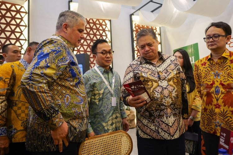 Menteri Koordinator Bidang Perekonomian Airlangga Hartarto bersama Wakil Menteri Perdagangan Jeffry Sambuaga berkesempatan menyambangi stand Rendang Goes to Europe produksi Bella Group, Rabu (18/10/2023). Airlangga mengapresiasi kerja sama yang telah dibangun oleh kedua perusahaan yang dapat memicu peningkatan perdagangan dan ekspor nasional.(KBRI Sofia)