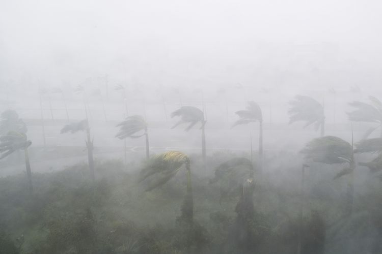 Angin kencang dan hujan dari badai Irma terlihat di Miami, Florida, AS, Minggu (10/9/2017). Irma, salah satu badai Atlantik terkuat dalam satu abad ini, menghantam Kepulauan Karibia, Kuba, hingga Florida, AS, telah menewaskan puluhan orang dan memporak-porandakan permukiman penduduk.(AFP PHOTO/SAUL LOEB)