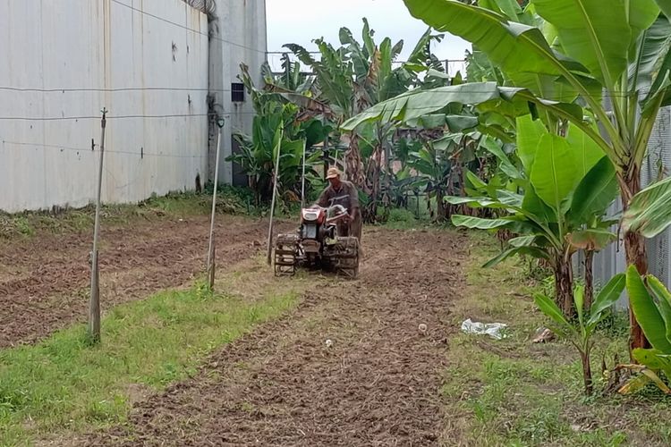 Seorang warga Binaan Rutan Batam sedang melakukan pembajakan lahan sisa yang ada di Rutan Batam Kelas IIA. Lahan ini disulap menjadi lahan produktif guna modal bagi warga binaan untuk mengembangkan keterampilan dan kemandirian mereka setelah mereka berada diluar, khususnya perkebunan dan pertanian.(KOMPAS.com/Hadi Maulana)