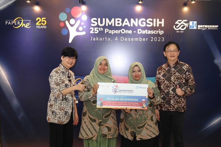 Dalam rangka mendukung pengembangan pendidikan di Indonesia, PaperOne-Datascrip menjalankan program Sumbangsih 25 Tahun kepada 12 sekolah dasar di kawasan Jadebotabek. Donasi dalam bentik peralatan sekolah diserahkan secara símbolis pada Senin (4/12/2023).(DATASCRIP/Patricius Dewo Putro)
