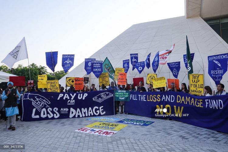 Aktivis lingkungan hidup menggelar demonstrasi di lokasi KTT iklim PBB COP28 di Dubai, Uni Emirat Arab (UEA), pada Rabu (6/12/2023).
