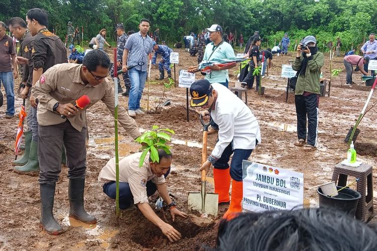 Kementerian Lingkungan Hidup dan Kehutanan (KLHK) bersama Tentara Nasional Indonesia (TNI) menanam ratusan anakan tanaman produktif di Kawasan Area 48 milik Pangkalan Udara (Lanud) El Tari Kupang, Nusa Tenggara Timur (NTT), Minggu (14/1/2024).(KOMPAS.com/Sigiranus Marutho Bere)