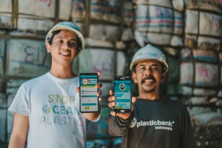 Pengepul memperlihatkan stok plastik di dalam gudang melalui aplikasi ponsel.