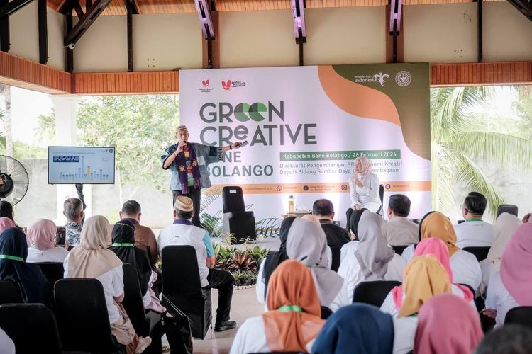 Menparekraf Sandiaga Salahuddin Uno bersama Bupati Bone Bolango, Merlan Uloli dalam acara Bimtek Pelatihan SDM Ekraf Green Creative, di Bandhayo Bone Bolango, Gorontalo, Rabu (28/2/2024).