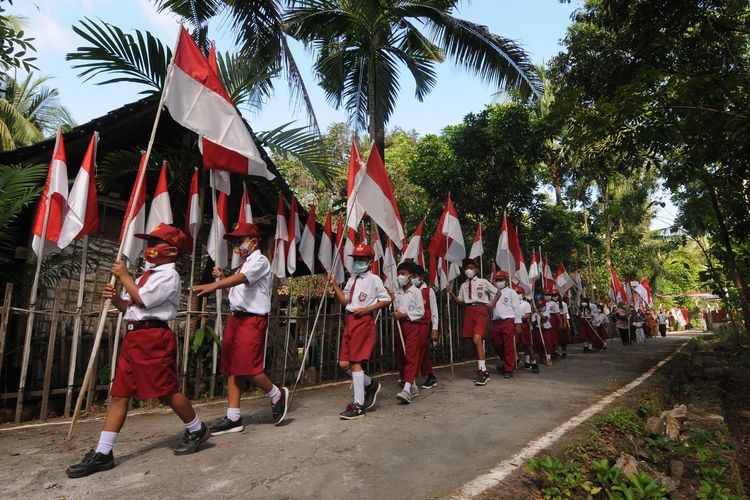 Sejumlah siswa mengikuti Kirab 76 Bendera Merah Putih di Bugel, Krakitan, Bayat, Klaten, Jawa Tengah, Sabtu (14/8/2021). Kirab dan memasang sebanyak 76 bendera Merah Putih yang diikuti siswa sekolah dasar dan sekolah menengah pertama tersebut bertujuan untuk menyambut HUT ke-76 Republik Indonesia serta menanamkan jiwa nasionalisme kepada generasi muda. ANTARA FOTO/Aloysius Jarot Nugroho/rwa.(Aloysius Jarot Nugroho)