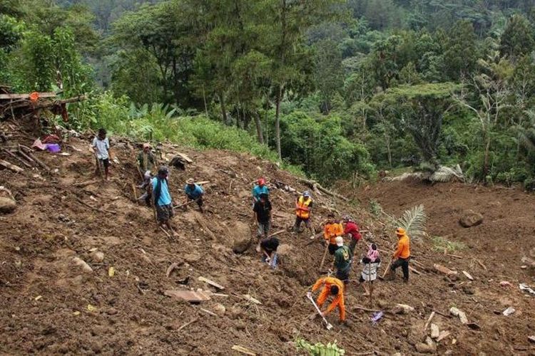 Tim SAR gabungan bersama warga melakukan pencarian korban tanah longsor di Palangka, Kelurahan Manggau, Kecamatan Makale, Kabupaten Tana Toraja, Sulawesi Selatan, Senin (15/4/2024).