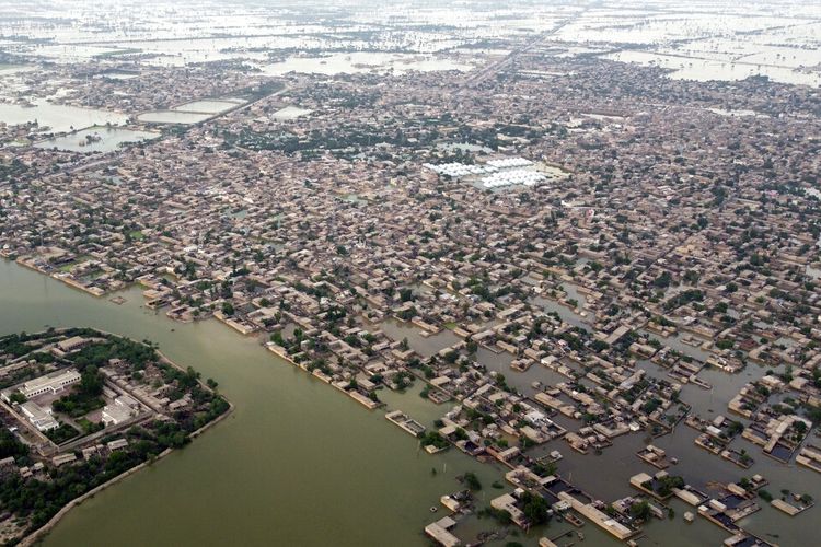 Rumah-rumah dikelilingi oleh banjir di Jaffarabad, sebuah distrik di provinsi Baluchistan barat daya Pakistan, Kamis, 1 September 2022.