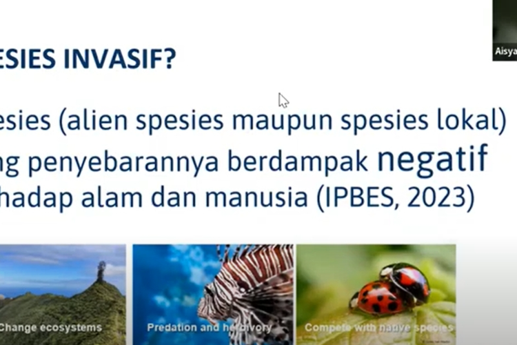 Peneliti Pusat Riset Ekologi dan Etnobiologi BRIN, Aisyah Handani memberikan materi dalam webinar Awasi dan Kenali Spesies Invasif Asing yang digelar Biodiversity Warriors, Jumat (17/5/2024).