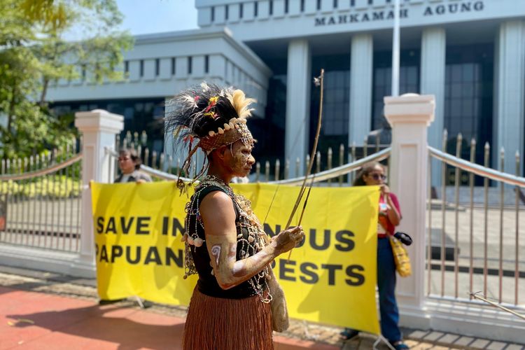 Masyarakat adat suku Awyu dan suku Moi, serta sejumlah aktivis menggelar aksi damai di depan Mahmakah Agung, Jakarta, pada Senin (27/5/2024), berharap Mahkamah Agung menjatuhkan putusan hukum yang melindungi hutan adat mereka.(KOMPAS.com/FAQIHAH MUHARROROH ITSNAINI)