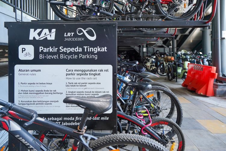 Sejumlah sepeda terparkir di parkiran sepeda salah satu stasius LRT Jabodebek.