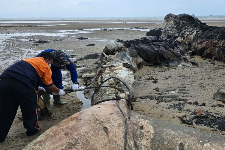Bangkai ikan paus sperma (physeter macrocephalus) di perairan Muara Teritip, 35 kilometer utara pusat Kota Balikpapan, Kalimantan Timur, akhirnya dibakar, Selasa (1/10/2024).