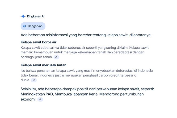 Google Gemini merespon pertanyaan misinformasi kelapa sawit.