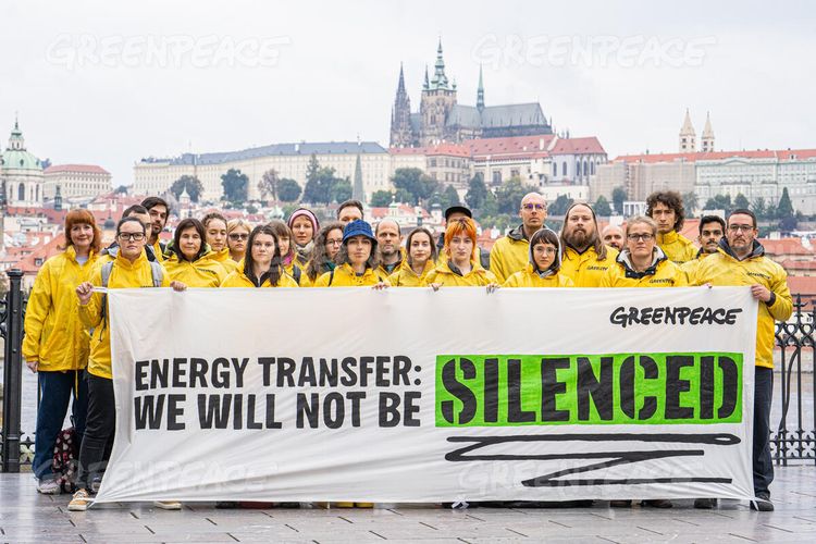 Sebagai bagian dari Pekan Aksi Global, para aktivis dan pendukung Greenpeace Republik Ceko membentangkan spanduk menunjukkan solidaritas yang meluas dari jaringan Greenpeace global untuk mengirim pesan kepada Energy Transfer, pada 2024.(RAY BASELEY/GREENPEACE)