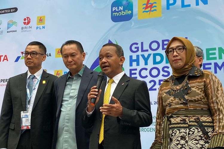 Menteri ESDM Bahlil Lahadalia menjelaskan soal pemanfaatan hidrogen untuk EBT, di Jakarta Convention Centre, Jakarta Pusat, Selasa (15/4/2025).