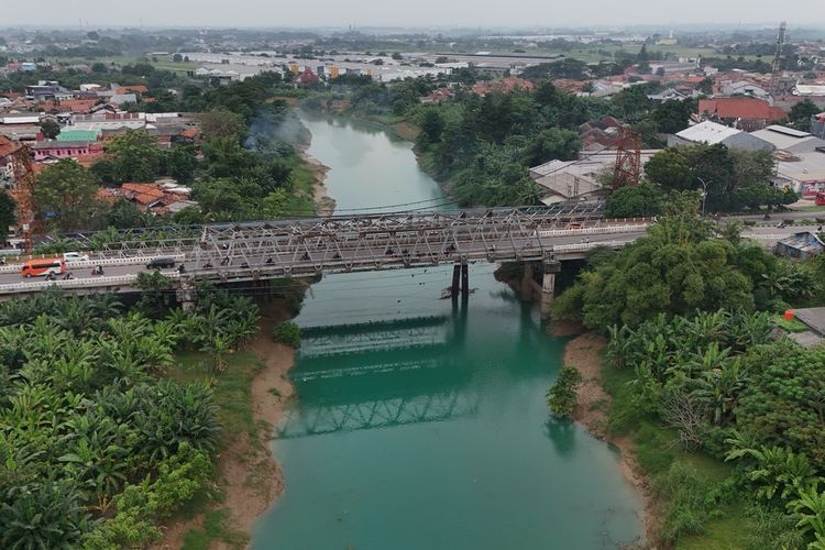 Air Sungai Citarum di Telukjambe Timur, Karawang, Jawa Barat berubah dari kecoklatan menjadi biru pada Sabtu (21/6/2025).(Dokumentasi Warga Husna Mubarok)