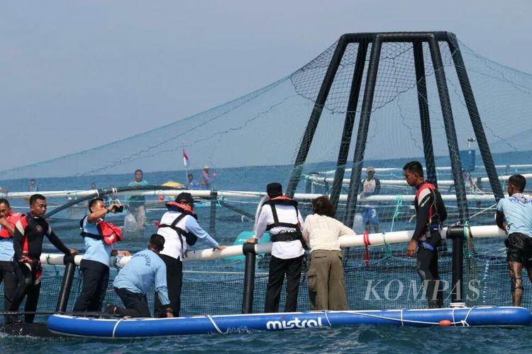 Keramba Jaring Apung (KJA) Lepas Pantai diresmikan Presiden Joko Widodo, pada 24 April 2018 di Pangandaran, Jawa Barat. Dalam KJA lepas pantai yang mengadopsi teknologi dari Norwegia ini, dibudi daya ikan kakap putih. (KOMPAS/NINA SUSILO)