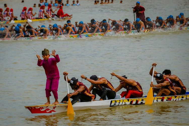 Suasana meriah Pacu Jalur Tradisional 2025 di Sungai Kuantan, Riau. Para pendayung beradu cepat mengayuh perahu tradisional, dipandu anak joki jalur yang memberi aba-aba.(Dok. Istimewa)