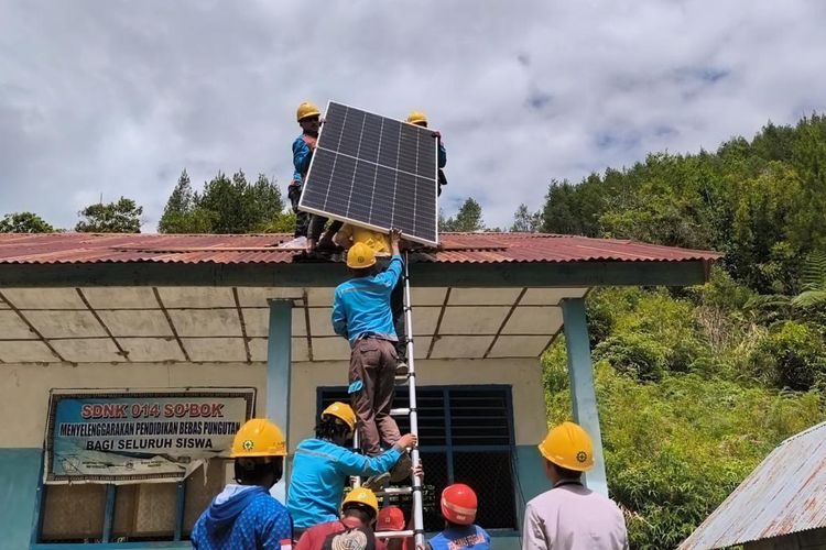 Petugas PLN tengah memasang panel surya di SDK 014 Sokbok, Kabupaten Mamasa, Sulawesi Barat. Sebanyak 25 sekolah di Kabupaten Mamasa telah menikmati listrik dari SuperSUN, dan 57 sekolah lainnya juga merasakan listrik dari perluasan jaringan PLN.