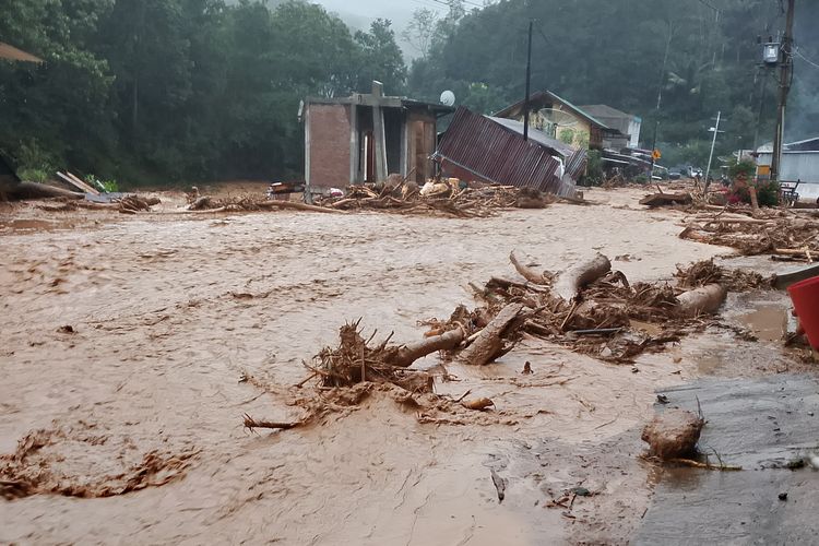 Kondisi banjir bandang disertai longsor di Kecamatan Rusip Antara. Hingga saat ini, puluhan desa di kecamatan tersebut masih terisolir akibat bencana alam yang terjadi sejak 26 November 2025.(KOMPAS.com/ IWAN BAHAGIA )
