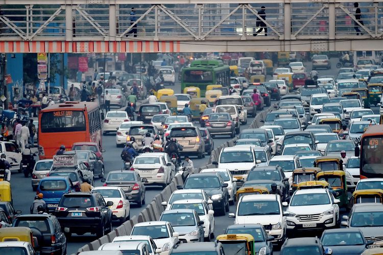 Potret ramainya lalu lintas di ibu kota India, New Delhi, pada 15 Oktober 2015. Sebuah studi menunjukkan, perluasan kota secara horizontal bisa membuat jutaan orang kehilangan akses air pipa dan sanitasi pada 2050.(AFP PHOTO/ROBERTO SCHMIDT)
