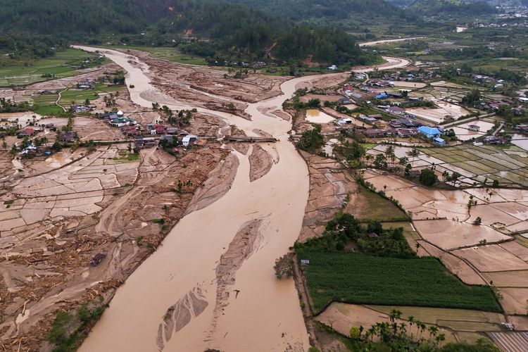 Foto udara dampak kerusakan pascabanjir bandang di Desa Rigeb, Kecamatan Blangkejeren, Kabupaten Gayo lues, Aceh, Selasa (2/12/2025). Banjir bandang yang melanda daerah itu pada Rabu (26/11) mengakibatkan empat orang meninggal dunia dan merusak ribuan rumah warga serta menyebabkan 15.110 jiwa dari 3.992 kepala keluarga terpaksa mengungsi, sementara akses utama menuju lokasi tersebut terputus sehingga menjadikan Gayo Lues terisolir. (ANTARA FOTO/Taufik Hidayat/Lmo/tom)