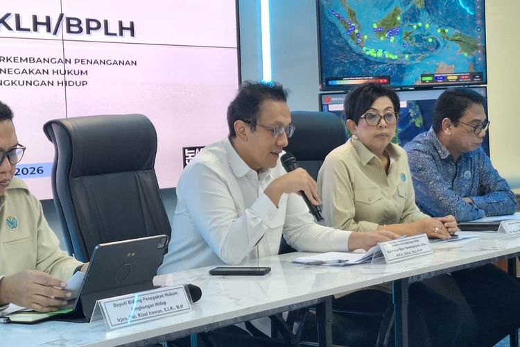 Sekretaris Utama KLH, Rosa Vivien Ratnawati (tengah) menyebutkan KLH bakal membicarakan nasib karyawan dari 28 perusahaan yang dicabut izinnya, Kamis (21/1/2026). (KOMPAS.com/ZINTAN)