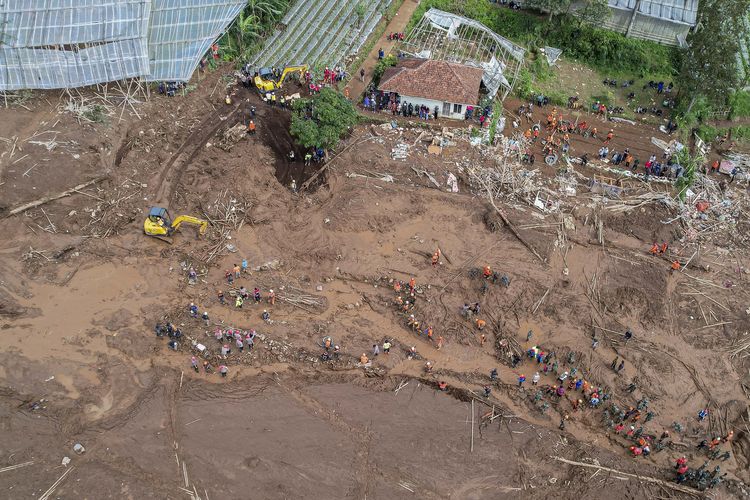 Foto udara tim SAR gabungan melakukan pencarian korban bencana tanah longsor di Desa Pasirlangu, Cisarua, Kabupaten Bandung Barat, Jawa Barat, Senin (26/1/2026). Berdasarkan data tim Disaster Victim Identification (DVI) Polda Jawa Barat hingga Senin (26/1) pukul 16.57 WIB, jumlah korban bencana tanah longsor yang berhasil ditemukan sebanyak 34 jenazah dan 20 diantaranya telah berhasil diidentifikasi. (ANTARA FOTO/Abdan Syakura)