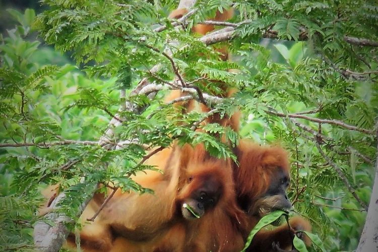 Dua individu orangutan Tapanuli tampak sedang memakan petai di kawasan hutan Batang Toru, beberapa waktu lalu. Petai adalah salah satu dari 124 jenis pakan yang disukainya.