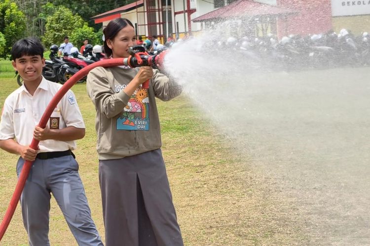 Simulasi kesiapsiagaan dan tanggap darurat bencana oleh siswai SMKN 3 Sendawar, Kalimantan Timur. (Dok. United Tractors)