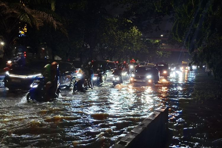 Banjir merendam Jalan Daan Mogot KM 13 dekat Rumah Pompa Daan Mogot, Cengkareng, Jakarta Barat, Kamis (29/1/2026) malam