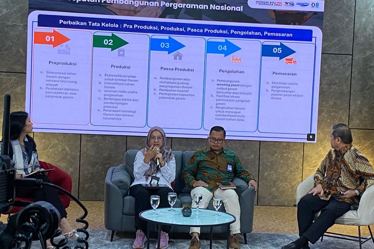 Direktur Sumber Daya Kelautan Ditjen Pengelolaan Kelautan KKP, Frista Yorhanita (dua dari kiri) menjelaskan target swasembada garam, Kamis (12/2/2026).