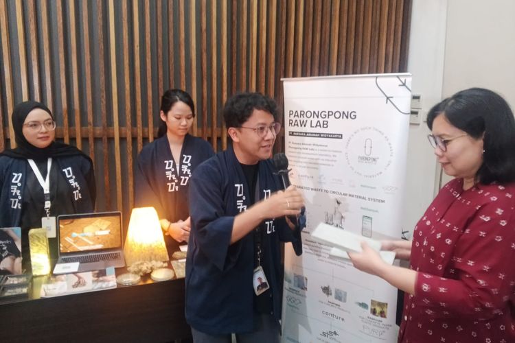 Pendiri Parongpong Recycle and Waste Lab, Rendy Aditya Wachid (kanan) memperlihatkan produknya ke Head of Group Marketing & Communications PT Bank DBS Indonesia, Mona Monika, dalam media briefing DBS Foundation Grant 2025 di Jakarta pada Selasa (10/3/2026).(Dok. DBS Foundation)